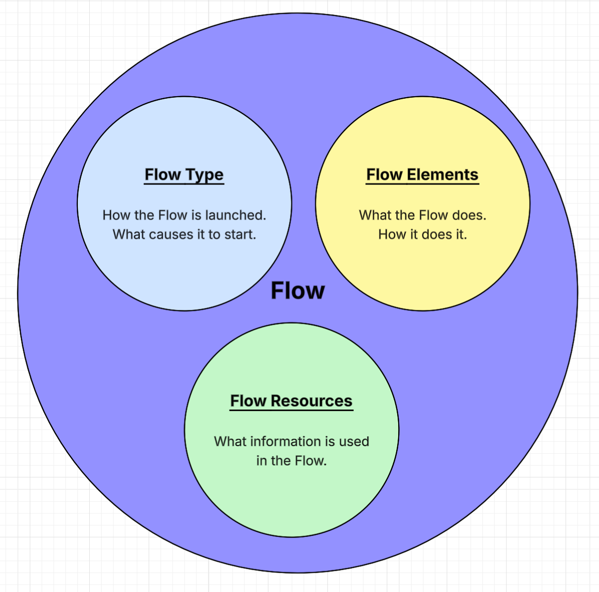 Every Flow consists of three building blocks that work together: Flow Type (when it runs), Flow Elements (what it does and how it does it), and Flow Resources (what data it uses)