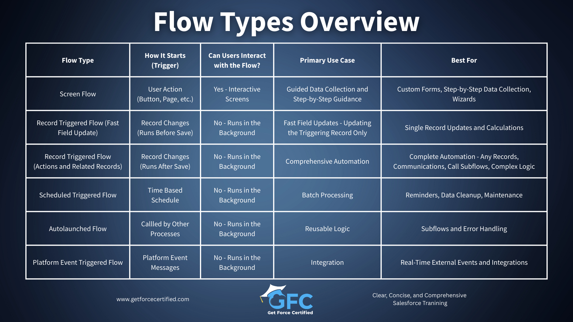 If you want to truly master Flow - including hands-on exercises, advanced techniques, and real-world implementation strategies - take a look at the Salesforce Flow Masterclass. For now, let's build your foundational understanding of Flow types.