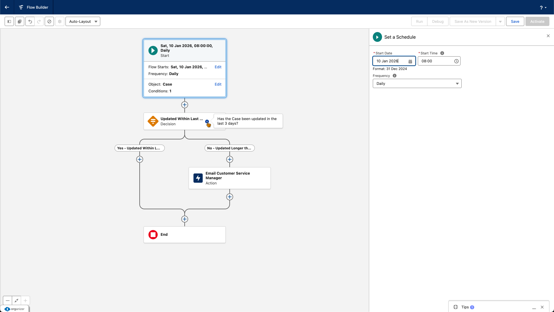 These Flows don't wait for data changes or User actions. They wake up at specified times, find all Records matching your conditions, and process them in batches. This makes them perfect for routine maintenance, periodic reminders, and time-sensitive updates.