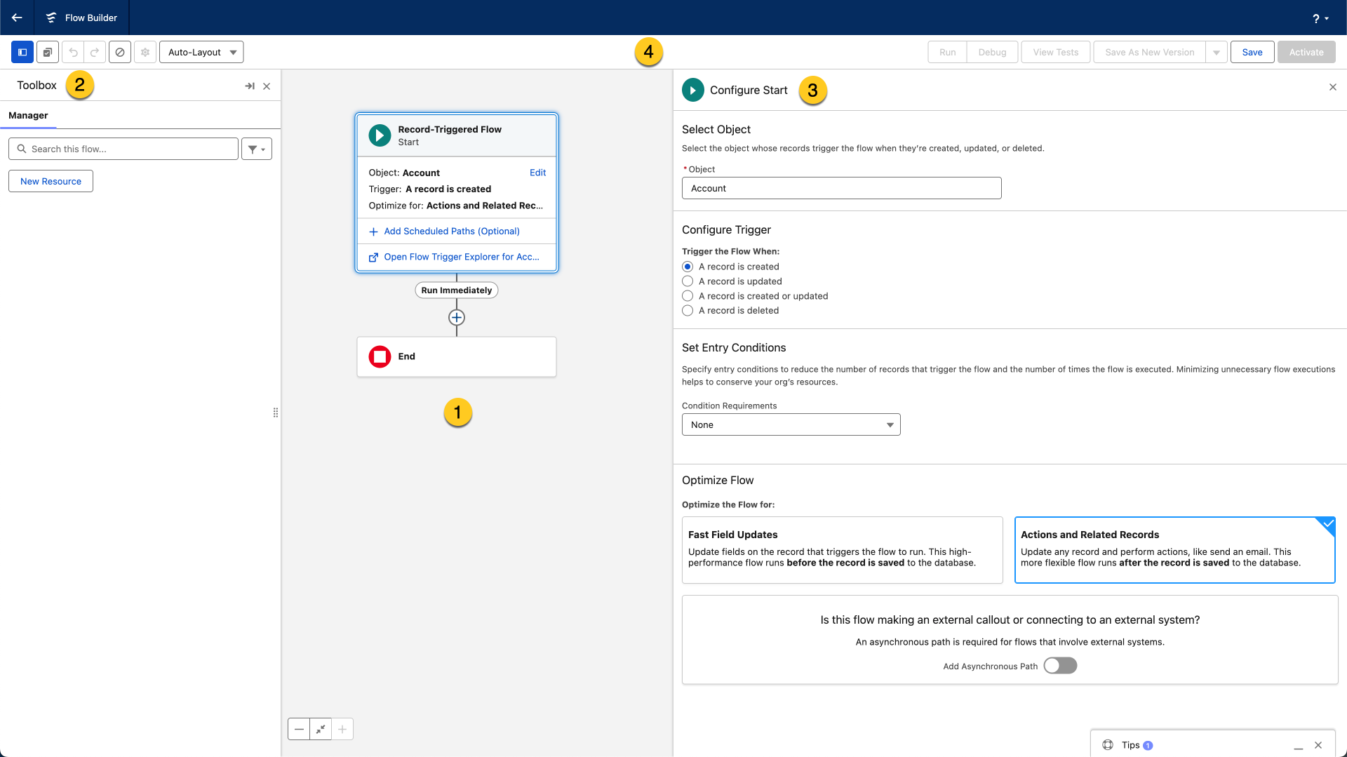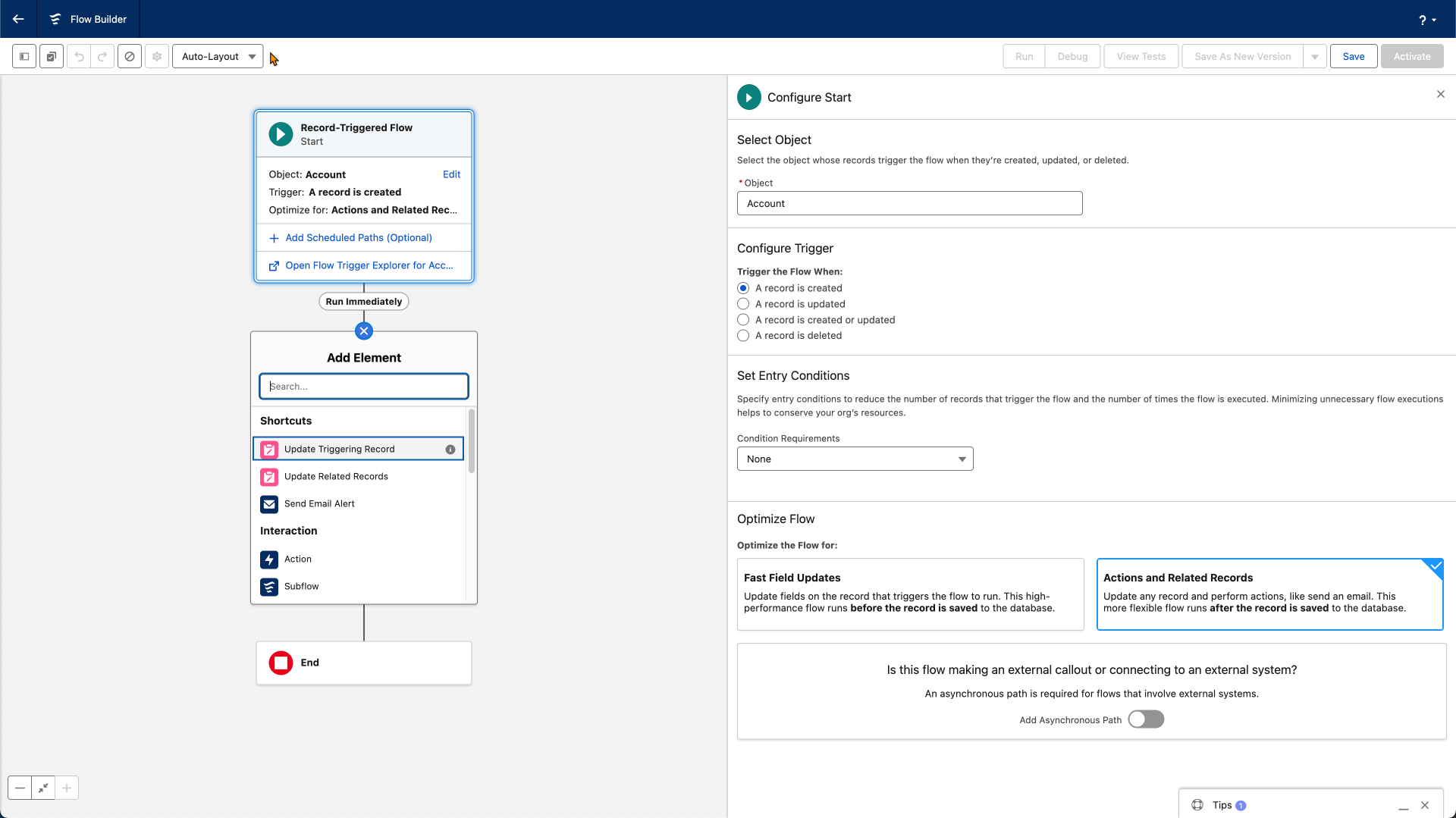 - Trigger: The event that causes a flow to run. Common triggers include "when a record is created," "when a field changes," or "at a scheduled time." These are dictated by the Flow Type that you build - e.g. Record Triggered, Scheduled, Screen etc.