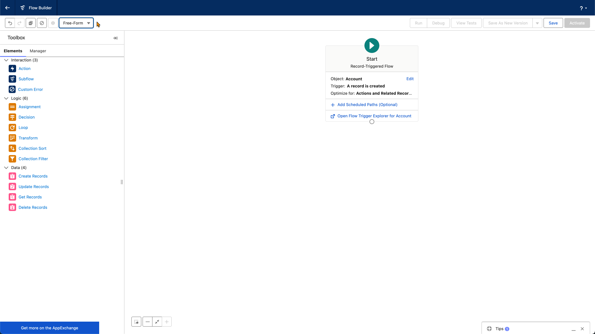 When you're ready to start building, you'll work in Flow Builder. While we'll cover Flow Builder in detail in a future article, here's what you can expect to see - the layout varies depending on if you are in Auto Layout or Freeform.