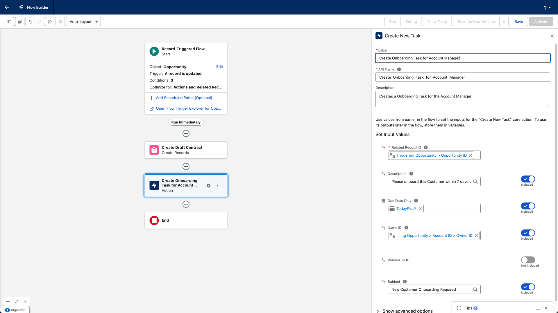 Use Case: When you Close Win a High-Value New Customer Opportunity ($500,000 or more), you want Salesforce to automatically create a draft Contract and a first task for the Account Manager.