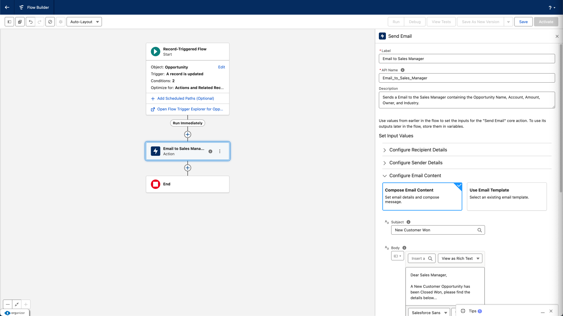 Use Case: When an Opportunity for a New Customer is marked as "Closed Won," you need to immediately notify the Sales Manager via email with details about the Opportunity.
